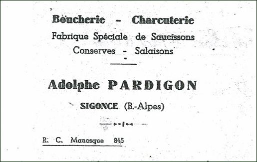 La Boucherie Adolphe et Madeleine Pardigon qui desservait les clients dans les années 1940/1950 se trouvait 10 rue du château 04300 Sigonce.