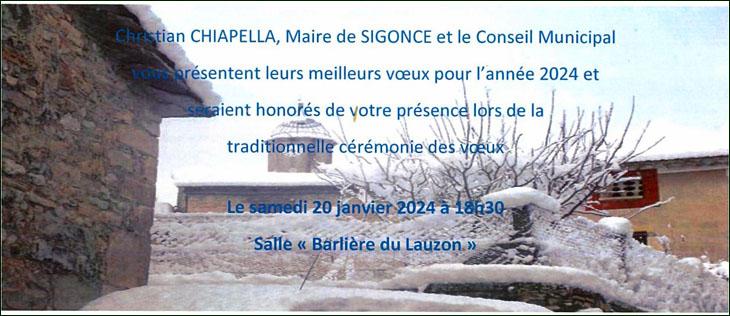 Ce 20 janvier 2024 à 18h30 de très nombreux Sigonçiers sont venus, "Salle Barlière du Lauzon" à l'invitation de M. Christian Chiapella maire et de son conseil municipal qui présentaient leurs vœux à la population.